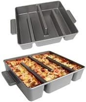 Our award winning Edge Brownie Pan was a big idea, but this one is BIGGER! (By 50%, in fact). It's our brand new Simple Lasagna Pan, and it's a smarter way to bake and serve everyone's favorite Italian dish. In a conventional pan, lasagna can get messy in a hurry. After a few servings are removed, the layers slump and the noodles slide.. and what's left in the pan starts to look a lot less appetizing (You'll know you're in trouble when your dinner guests put down their forks and reach for their spoons). Our Simple Lasagna Pan solves this problem by keeping the noodles and layers neatly stacked, regardless of how many portions are removed. Each serving of lasagna is held in place by the pan's inner walls, so even the last bite will look (and taste) as good as the first. The single baking chamber allows sauces to flow evenly throughout the pan, and the durable nonstick coating releases even the stickiest foods with ease. Lasagna also bakes more consistently in the Simple Lasagna Pan because more heat is distributed to the pan's middle, where food typically takes longer to bake. The nonstick pan is constructed of hard anodized cast aluminum for superior durability, and it's 100% made in the USA. Each pan comes complete with a custom nylon spatula and lasagna recipes insert.