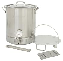 Bayou Classic pairs traditional form and professional quality with trendy innovation. This stainless 8-gallon Brew Kettle is designed for serious home brewers. It starts with a stainless steel 5 millimeter tri-ply 8 gallon brew kettle with side calibration marks measuring gallon and quarts. It also includes a stainless vented lid, a stainless ball valve, brew thermometer with 3 inch face 0-220 degrees, stainless false bottom that sets 3.25 Inch above the bottom of the pot and a tube shaped filter screen. The try-ply bottom promotes even heating and fights against scorching, while the all stainless construction has no interaction with worth or acid. The narrow diameter and high side walls reduce the chance of boil overs and the false bottom fits tightly on the low side indention to reduce particles and grain from entering the spigot chamber.