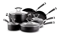 Professional heavy guage hard anodized construction, TOTAL NONSTICK system features High-Low wave technology, Advanced nonstick inside and outside of cookware, Contemporary, stylish double riveted stainless steel with silicone handles, Domed, tempered glass lids with stainless steel rims.