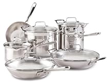 Emeril by All-Clad Chef�s Stainless Set is designed for Chef cooking techniques and built to last a lifetime. Professional 18/10 stainless construction with aluminum encapsulated base distributes heat evenly. Comfortable Chefs handle makes it easy to Saute, stir, and carry pans. Elegant hand-polished finishes. Compatible with all cooktops, including induction. Oven safe to 350-degree F. Limited Lifetime Warranty. What�s in the box: 8-Inch Saute Pan Fry Pan 10-Inch Saute Pan / Fry Pan with Glass Lid 1.5-Quart Source Pan with Pouring Spout and Glass Lid 3-Quart Sauce Pan and Glass Lid 3-Quart Steamer Insert 11-Inch Everyday Pan and Glass Lid 6-Quart Stockpot and Glass Lid.