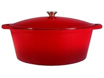 Le Chef enameled cast iron dutch oven is conducts and retains heat while withstanding the rigors of daily use. It goes from freezer to oven to table with ease, evenly diffusing heat to keep food warm at the table. Won't absorb fat, odor or bacteria. Tight-fitting lid locks in moisture and flavor resulting in tender roasts and stews. Le Chef Porcelain Enamel Cast Iron Dutch Oven is hand-cast from molten iron in individual sand molds. The raw iron pieces is hand prepared before several layers of enamel are applied and baked in very high temperature ovens. No seasoning required Safe on all cook tops and in the oven to 475 degrees FEnameled Cast Iron knob.The flat bottoms are enameled as the red two tone exteriorDimension: 15"Lengthx 11 5/8"Widthx 5 5/8 "Depth (Not INCLUDE the handles) Product Features: Enamel Cast Iron Interior: Enameled Beige Exterior: Enameled Cherry Red Capacity: 9 1/2 Quarts.Country of Origin: China.