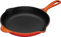 Le Creuset Enameled Cast-Iron 11-3/4-Inch Skillet with Iron Handle, FlameCast iron skillets have long been treasured kitchen staples for stovetop frying and oven baking � and the Iron Handle Skillet from Le Creuset delivers that same level of reliable performance time and time again. With a durable satin black interior enamel and brilliant exterior enamel, the Iron Handle Skillet is protected inside and out from chipping, cracking and excessive wear. Over time, the skillet's slightly abrasive interior develops a natural patina that is ideal for searing and frying. Comfort foods like cornbread are often prepared in a cast iron skillet lined with bacon drippings or vegetable oil � and chefs everywhere attest to the cast iron skillet's unique ability to produce the desired balance of a crispy golden crust and a soft, fluffy interior.