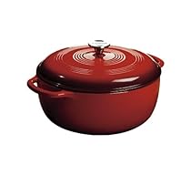 Lodge Color Porcelain Enamel on Cast Iron cookware is cast from molten iron in individual sand molds. The porcelain surface eliminates the need to season cast iron. This 7.5 Qt Enamel Dutch oven is great for cooking, marinating, refrigeration and freezing. The color porcelain enamel on cast iron can be used on gas, electric, ceramic and induction cooktops, as well as in the oven. Not recommended for use on outdoor grills or over open outdoor flames. Not for use in microwaves. The cast iron vessel has superior heat distribution and retention, evenly heating bottom sidewalls and even the lid. Tightly fitting lid seals in moisture. The excellent heat retention reduces the amount of energy needed for cooking. Two layers of very hard, glossy porcelain enamel are chip resistant and easy to clean. Lid knob is oven safe to 400 degrees Fahrenheit. The black rim on the pot is matte porcelain, not exposed cast iron. Hygienic porcelain enamel is non-reactive with food. Although dishwasher safe, hand washing with warm soapy water is recommended to preserve the cookware's original appearance. 12" diameter, 4 3/4" deep. Island Spice. Imported.