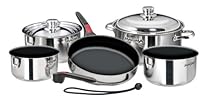 10 Piece Stainless Steel "Nesting" Cookware Coated with Teflon Select Non-Stick CoatingsThe quality and value you've e to expect from all Magma products now in an 18-10 stainless steel cookware set that nests for storage in less than 1/2 cubic foot of cabi space. This set features DuPont Teflon Select Non-Stick coatings for worry-free cooking and simple clean-up. The set includes three Sauce Pans (1-1/2 qt. 2 qt. and 3 qt.) a Lid that fits all three saucepans a 5 qt. Stock Pot a 9-1/2 inch diameter Saute Pan a lid for the Stock Pot and Saute Pan 2 removable handles and a convenient Bungee storage cord. All have triple clad bottoms (stainless steel aluminum stainless steel) and are milled perfectly flat for even heat distribution on gas electric or ceramic cooktops. All the cookware is oven safe and dishwasher friendly. Yacht quality cookware at a value price. Product : MAGMA NESTABLE 10 PIECE TEFLON COATED S.S. COOKWARE SET Manufacturer : MAGMA PRODUCTS Manufacturer Part No : A10-365L UPC : 088379113651.