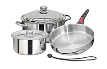 The quality and value you've come to expect from Magma's current 18-10 stainless steel cookware sets now available in a 7 piece starter set. This nesting cookware stores in less than 1/2 cubic foot of space. Includes: 5qt. Stock pot, 9-1/2" saute pan, stock pot/saute pan lid, 2qt, sauce pan, universal sauce pan lid, removable handle, and "bungee" storage cord. Each pot has a sealed triple clad bottom (stainless steel, aluminum, stainless steel) and is milled perfectly flat for superb even heat distribution on gas, electric, or ceramic cook tops. With benefits of being oven safe, dish waher friendly and the option of adding to your set by purchasing additional pieces, this set is a must have. Professional quality cookware at a value price for boaters, outdoorsman, or RV enthusiasts just getting started or for the seasoned pro who expects only the best.