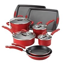 The Rachael Ray Porcelain II Cookware Collection offers performance, fun colors and solid construction and this stylish and functional 12-Piece Cookware Set has the essential shapes and sizes needed in any kitchen, including a pair of handy baking sheets. The sturdy materials of both the cookware and bake ware promote even heating, helping to reduce hot spots that can burn foods and the porcelain cookware exteriors with their two-tone gradient hue are colorful and durable. Use the small saucepan for Rachael's Salsa Verde Gravy, the stockpot for one of her signature "stoups" and the sauté, skillets and other pans round out a set that's as versatile as cookware gets. Tempered glass lids on covered pieces form a tight seal with the cookware to help hold in heat and moisture. The distinctive rubberized handles are oven safe to 350°F and offer dual-riveted strength and a comfortable grasp while cooking. The set includes two durable carbon steel nonstick cookie sheets with grippy handles that are oven safe to 500°F. Get your kitchen going in long-lasting style and performance with every piece of the Rachael Ray Porcelain II 12-Piece Set.