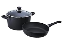 Famous Scandinavian design, traditional, sold craftsmanship and the latest advances in technology combine to set Scanpan Classic Cookware apart.Scanpan Classic is hand cast aluminum under 200 tons of pressure.The optimum thickness of the pan base prevents warping and keeps the pan base perfectly flat, especially important when used with glass top or ceramic ranges.The patented nonstick surface is created by firing a ceramic-titanium particles into the pan and a specially formulated nonstick compound is embedded in the ceramic-titanium surface.The pan thickness and unique ceramic-titanium surface allows for browning, searing and deglazing.Scanpan Classic can be used with high heat for stir frying and is oven safe to 500-degrees.Glass covers let you see what is cooking.Scanpan Classic is safe to use with metal utensils and comes with a Lifetime Warranty.Made in Denmark.Bonus Set includes: 6.5-quart Covered Stockpot and 10.25" Open Saute Pan (Stockpot Cover fits Saute Pan).