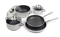 Developed in Germany and used in hundreds of thousands of European kitchens, Stoneline cookware has the strength of cast iron skillets, the chef-quality weight of aluminum, and a stone micro-coating so naturally nonstick that even eggs and cheese just slide right out without greasing the pan. Unlike other nonstick pans, Stoneline's hot-stone cooking surface resists scratches and gets hot enough to sear meats to lock in juicy flavor. It also cooks evenly so pancakes brown beautifully without scorching. And for all foods - even sticky mac and cheese or a simmered-all-day stew, Stoneline simply wipes clean with a paper towel! The 8-piece set handles just about anything you'd ever want to cook on your stove: 8-piece set includes: - 1 roasting pot (9 ½" diam/ 4" ht/4 ¾" quart)- 1 cooking pot (8" diam/5" ht/2 ½" quart)- 1 cooking pot (6 ¼" diam/3" ht/1 ¾" quart)- 1 frying pan (9 ½" diam/ height: 1 ¾")- 3 glass lids (6 ¼"/8"/9 ½" )- 1 frying pan - BONUS FREE GIFT (11" diam/ 2 ½" ht)Stoneline warranties the cookware to be free from defects in workmanship and material under normal use and service for a period of 12 years.Chef-quality cookware; Works on gas, electric, ceramic and induction stovetops.