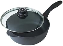 A true kitchen workhorse, the Swiss Diamond 4.3 qt (11”) saute pan has deeper sides than a fry pan, making it perfect for sauces, vegetables, cubed meat, etc. Includes lid. The included tempered glass lid allows you to monitor food without lifting the cover, maintaining flavor and keeping food from drying out. The rotating lid knob opens or closes a steam vent to release or contain moisture as needed. Used by discerning home chefs around the world, Swiss Diamond’s PFOA-free cookware features unsurpassed nonstick performance for healthy cooking and easy clean-up. The patented nonstick coating, reinforced with real diamond particles, allows oil-free cooking and cleans up with just warm soapy water. No more scrubbing and soaking! Swiss Diamond’s patented nonstick coating is reinforced with real diamonds for excellent durability and resilience. Why diamonds? Three reasons: they are durable, they are naturally nonstick, and they conduct heat better than any metal. A perfect combination for a lifetime of cooking excellence.Swiss quality is visible in every aspect of Swiss Diamond cookware. Heavy-duty cast aluminum will never warp, while the perfectly flat base distributes heat evenly and will not tip or spin. The rivet-free interior prevents unsightly food build-up that can lead to bacterial growth. The ergonomic handle, designed for comfort and balance, stays cool on the stovetop. All Swiss Diamond products are oven-safe up to 500 degrees F (260 degrees C) and suitable for use on gas and electric cooktops – induction series sold separately. Made in Switzerland.