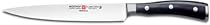 Carving knives are designed to cut long thin slices of roast or poultry. The thin blade allow you to easily carve meats and large fruits. Wusthof Classic Ikon is a culmination of all the best features of each of the Wusthof knife lines. The combined riveted handle design is combined with a contoured shape to add comfort and control. The Classic Ikon adds a rear bolster that acts as a counter balance when using the knife.This second bolster adds significant blade control.Classic Ikon has a unique forward bolster as well.The forward partial bolster is designed so you can sharpen the complete length of the blade.This bolster is also curvered inwards to allow your fingers greater control while holding the knife by the blade.Located in The Cutlery Capital of the World, Solingen Germany, the Wusthof factoryhistory goes back as far as 1814 when the company was listed with the Duchy of Berg. To this day, the company remains family owned.Throughout it’s history, Wusthof has focused almost solely on the manufacturing of forged knives for the professional chef and home cooking enthusiast.Wusthof uses a special blend of German steel through out the whole length of the knife. The ingredients of this steel are proudly etched on each blade. Wusthof not only uses the best materials to make a fine knife,but it is also crucial that each blade is precisely tempered.This tempering allows the knife to hold its edge for an extremelylong time, yet still be able to be maintained in your home kitchen with out the need to be sent away for maintenance. Our unique compound angle is not seen in many knives.This angle tapers from the spine of the knife to the edge to allow for a sturdy, yet extremely sharp edge while it also tapers from the bolster to the tip to give the knife strength as well as flexibility.